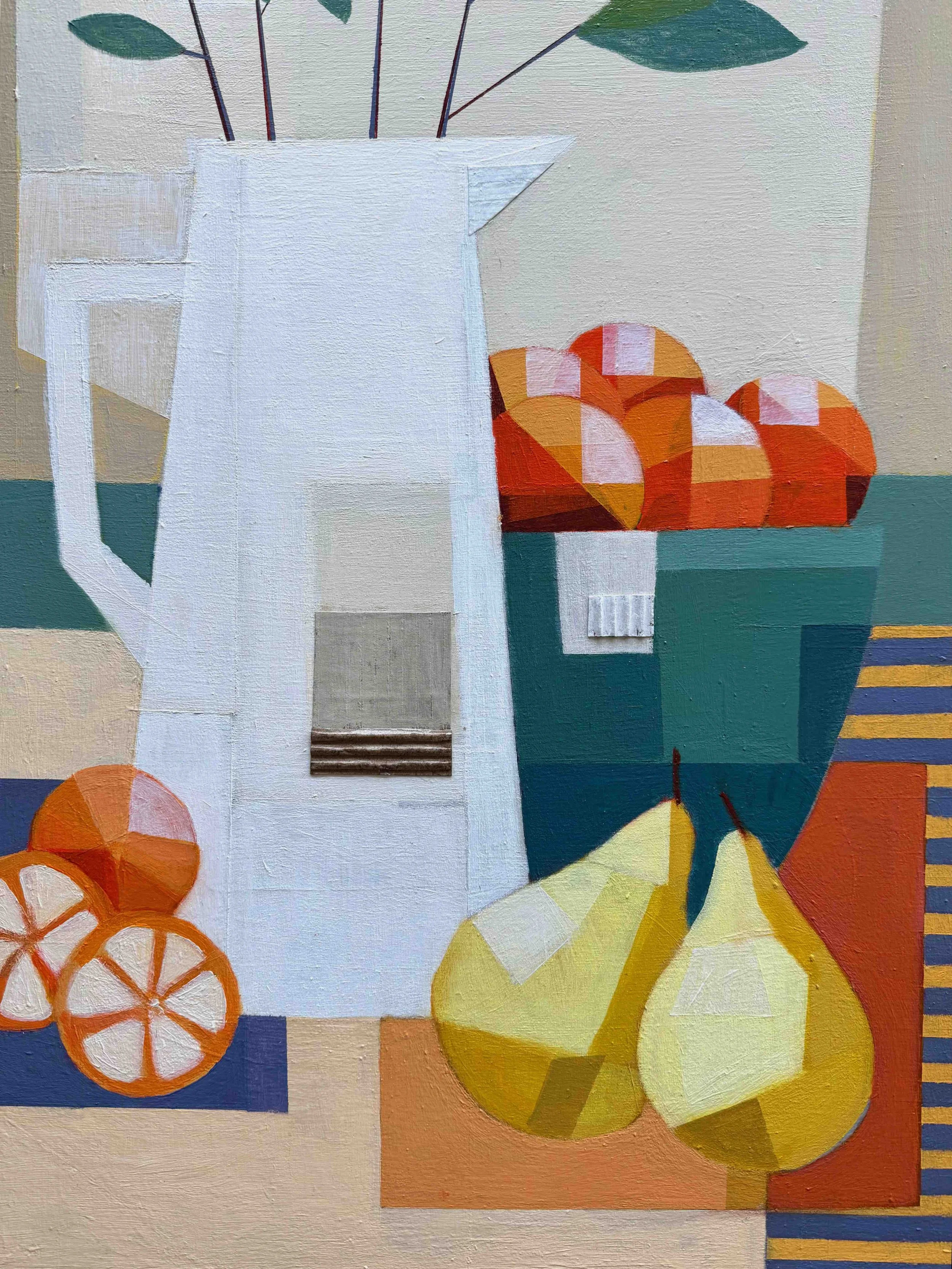 Bethany's focus is on exploring the textures and shapes that underpin familiar domestic objects in Still Life arrangements and the interaction between the objects within the space. Collage is integral to this exploration allowing the work to be both painted and 'built' up in layers as she examines the relationships that are playing out on the painting surface. Exploring colour relationships is also vital to Bethany’s practice and using colour to celebrate the joy that can come from noticing arrangements in the domestic space.