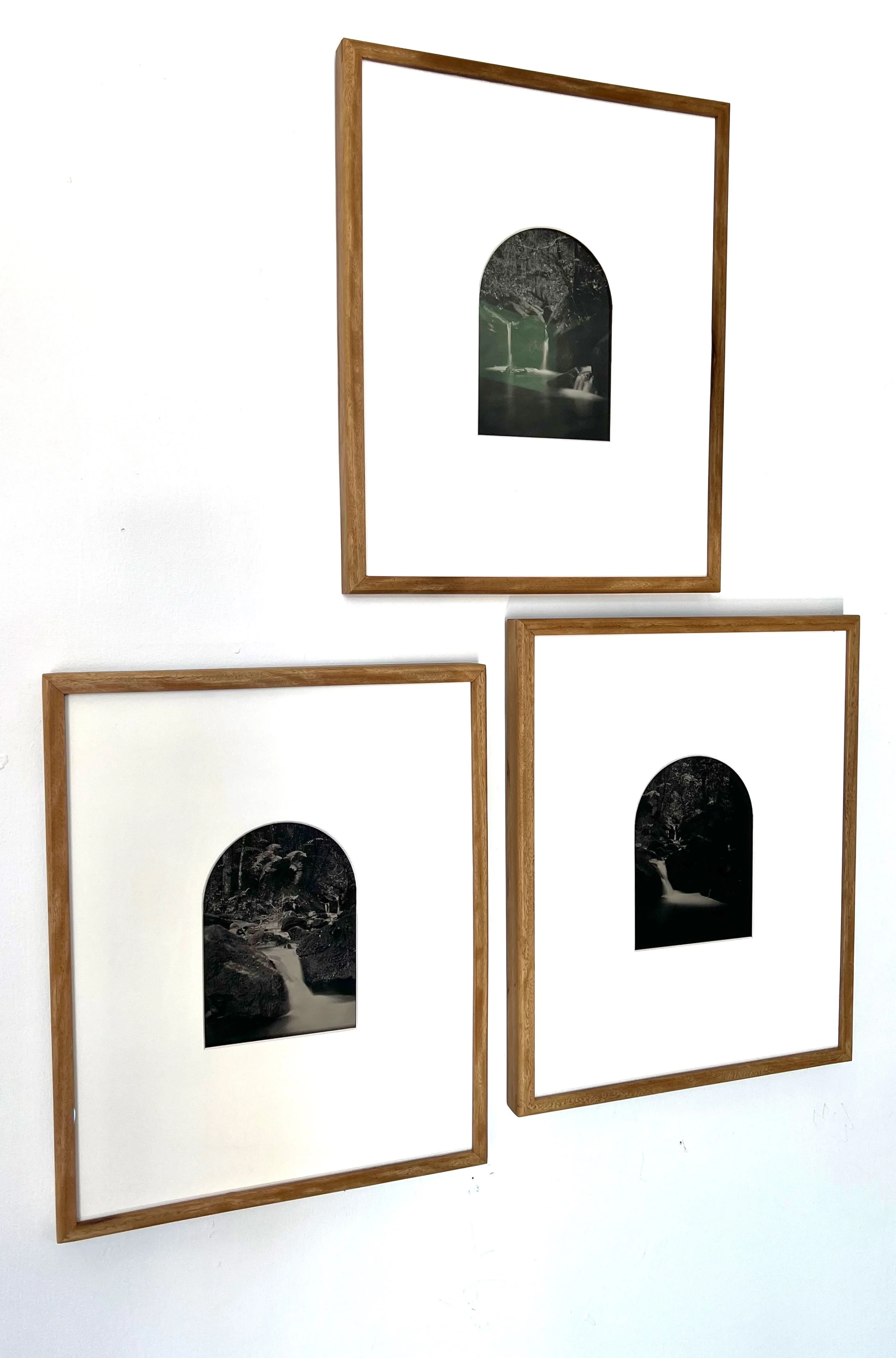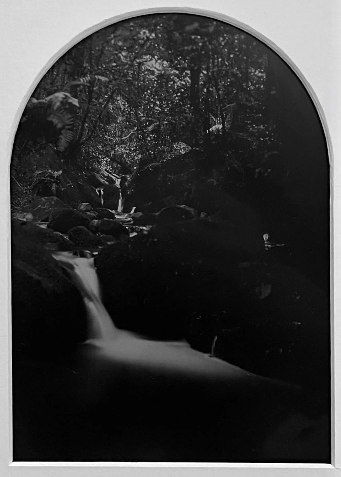 “Ginin-ginin-derry I, II and III are camera original tintypes framed in reclaimed lumber frames. The tintypes were created on Gundungurra land, at Pulpit Hill Creek in the Megalong Valley. Through exposure times of around four minutes, Ginin-ginin-derry I and II bring to light the motion of the changing creek bed landscape, as well as the mutableness of the wetplate photographic process, via stasis. Ginin-ginin-derry is Gundungurra and Ngunawal for ‘sparkling like a waterfall’.”