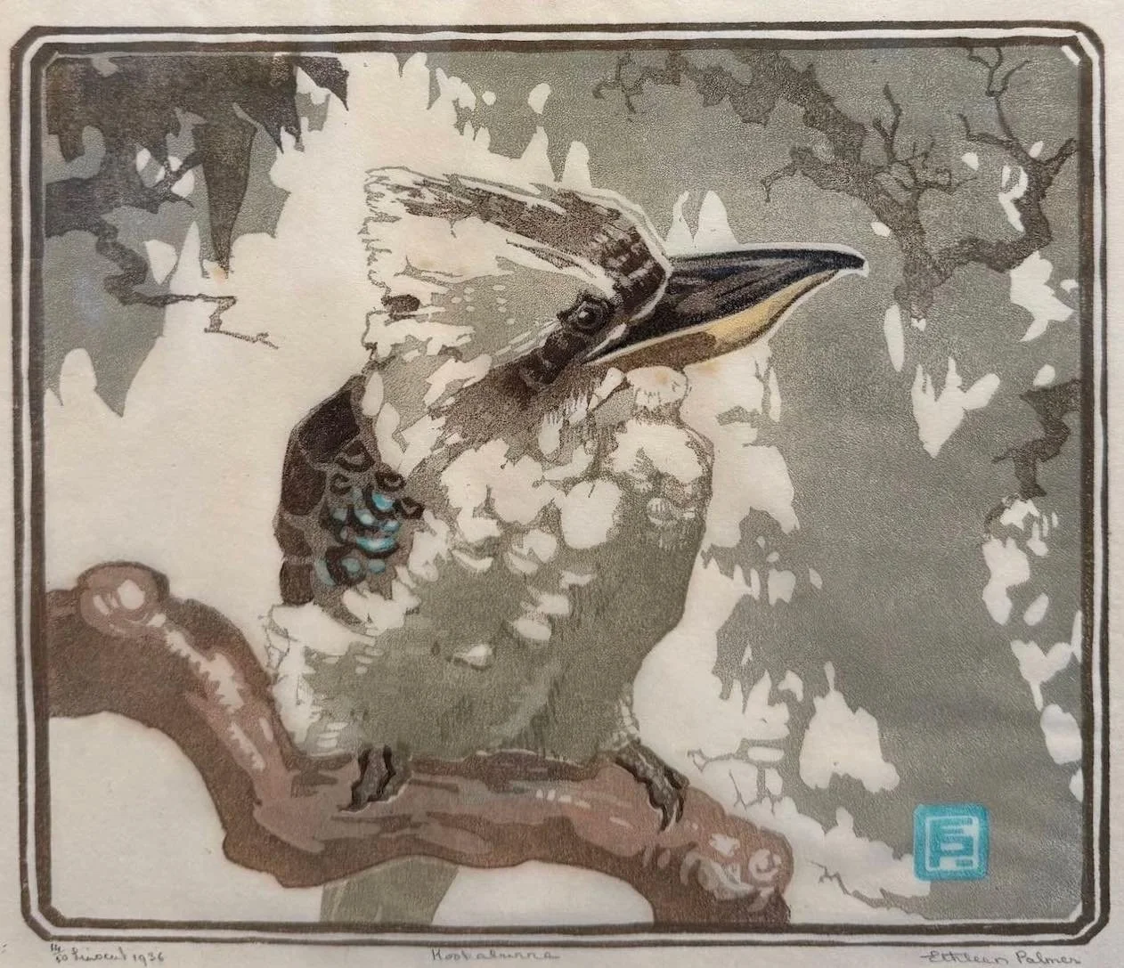 Ethleen Palmer major contributor to the female print movement of the 1920s and 30s. Her contemporaries were Preston, Proctor, Spowers, Blackburn etc. Rather than imitating the style adopted by these iconic artists she created prints with a distinctly Japanese feel. Her ability to capture movement and nature in the Japanese style gave her the name “The Australian Hokusai”.