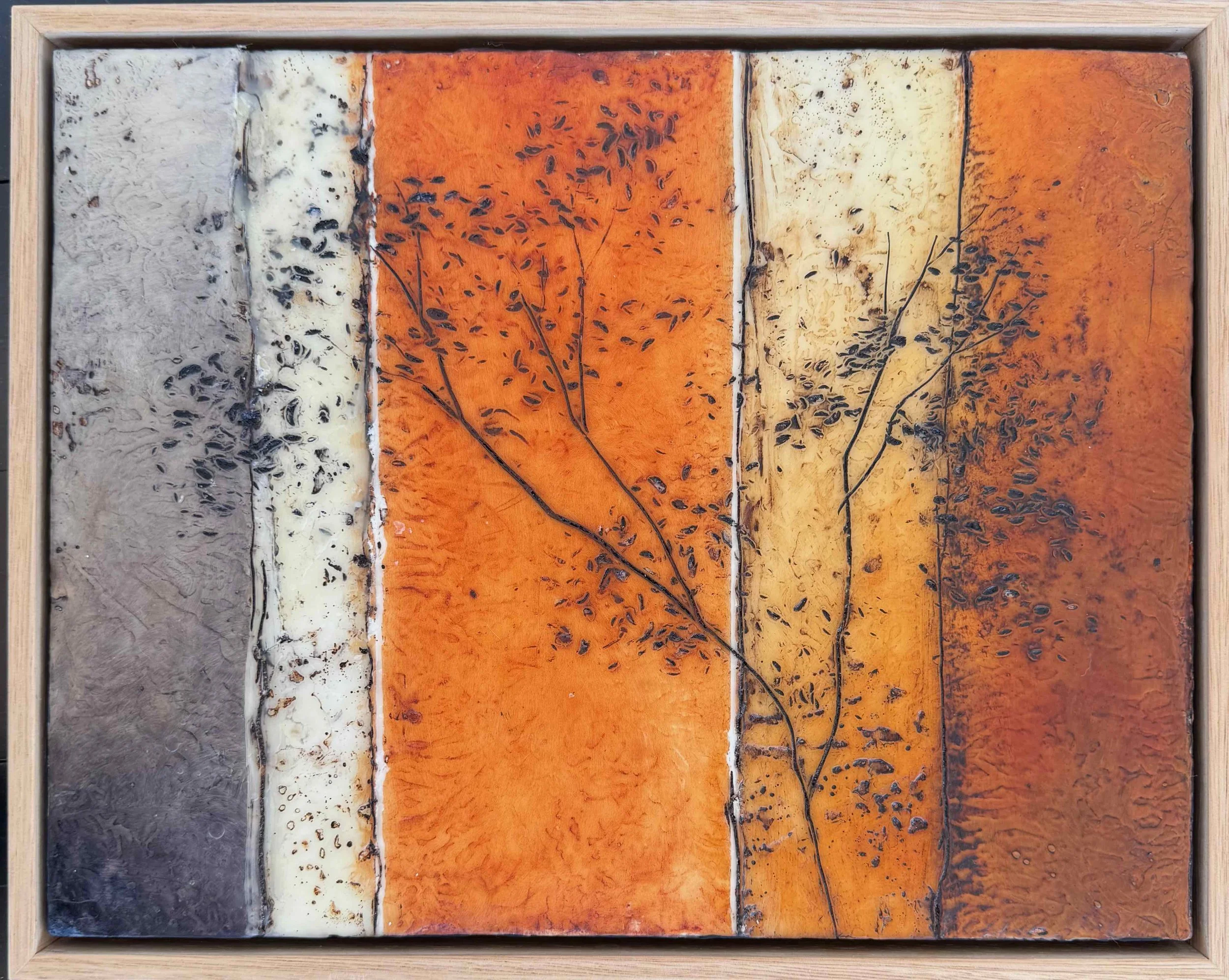 Her wax encaustic builds on her experience with both acrylic painting and print making, utilising as it does both modalities.