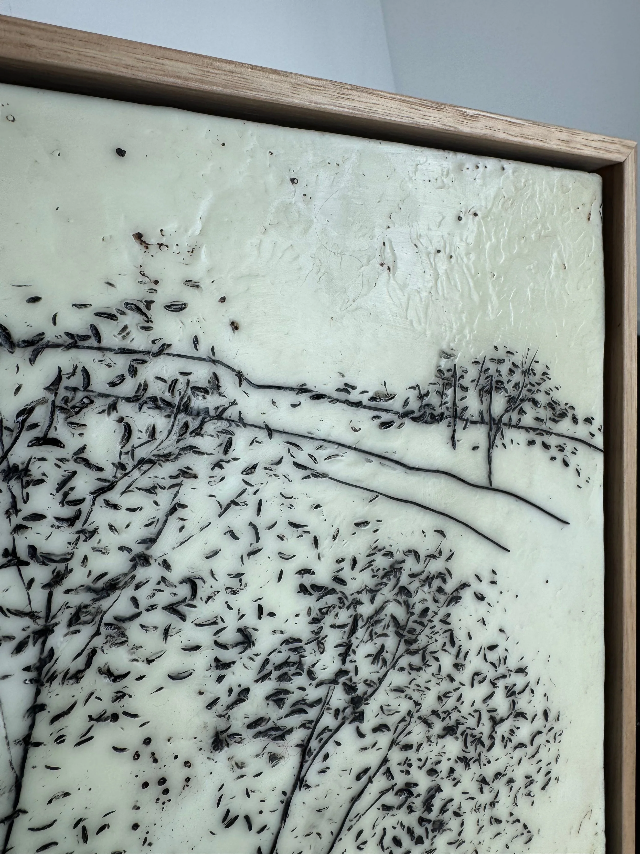 Her wax encaustic builds on her experience with both acrylic painting and print making, utilising as it does both modalities.