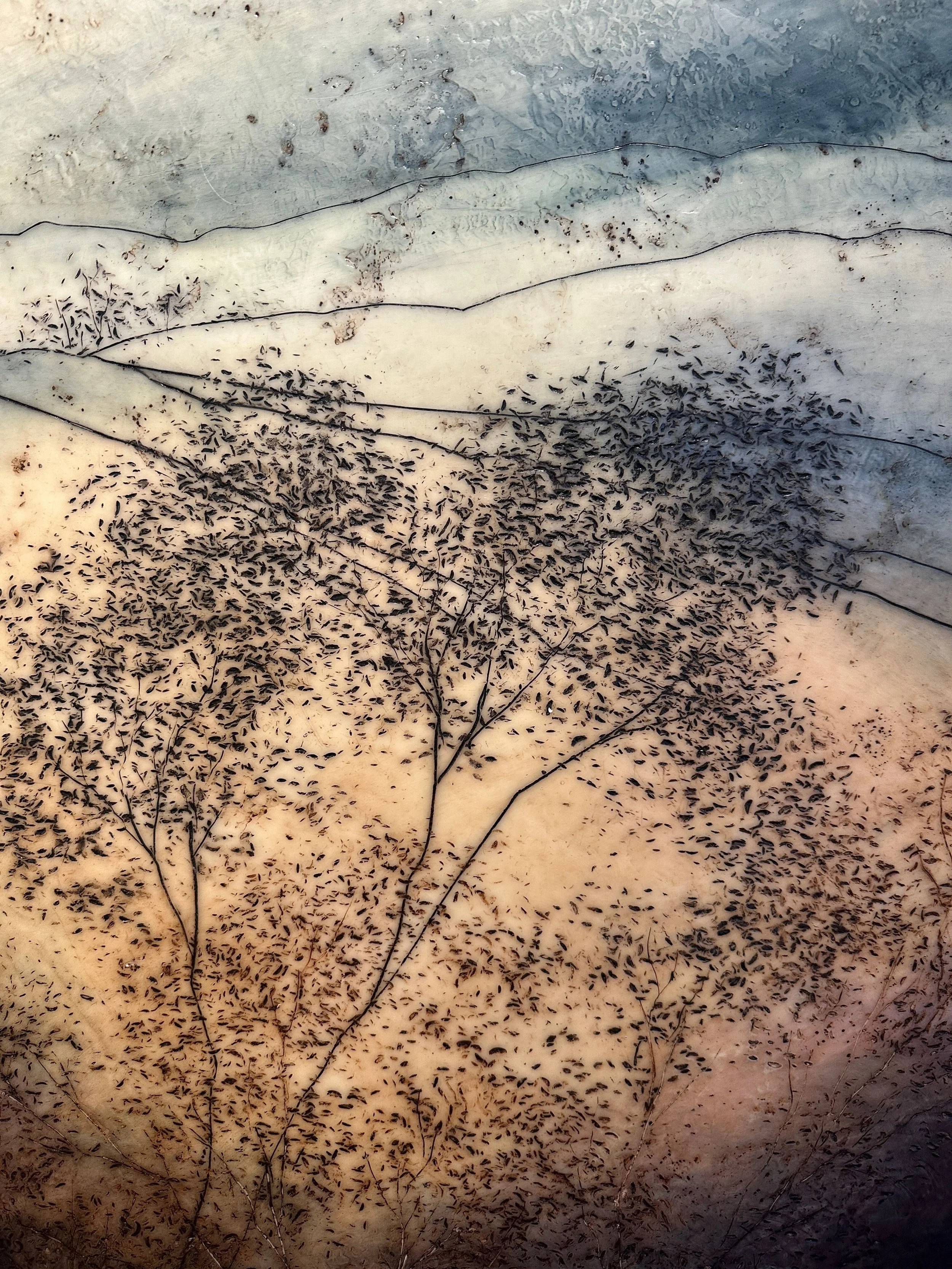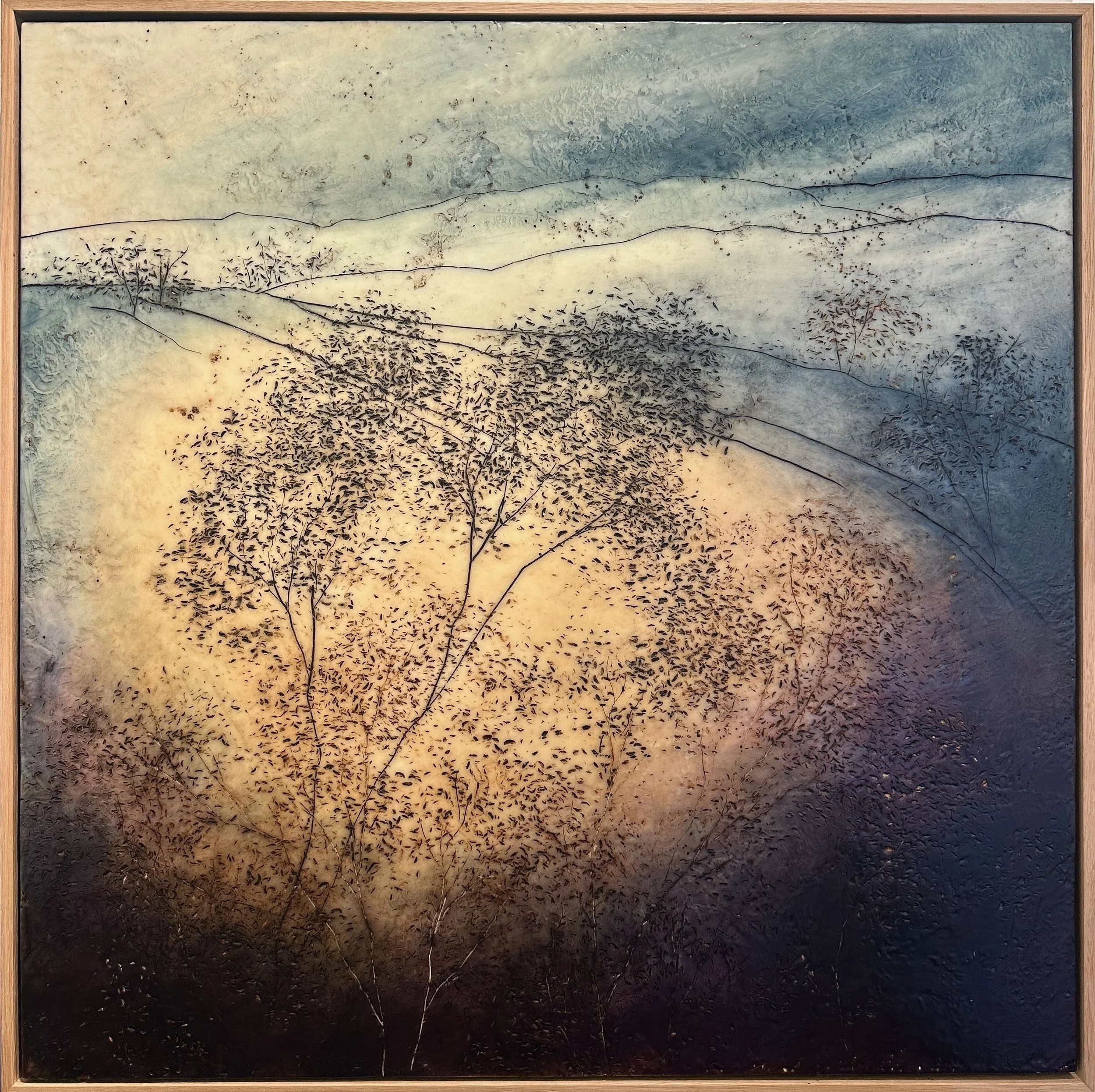 Kathryn works with wax encaustic, oil, acrylic, and mixed media to create these captivating textural landscapes.