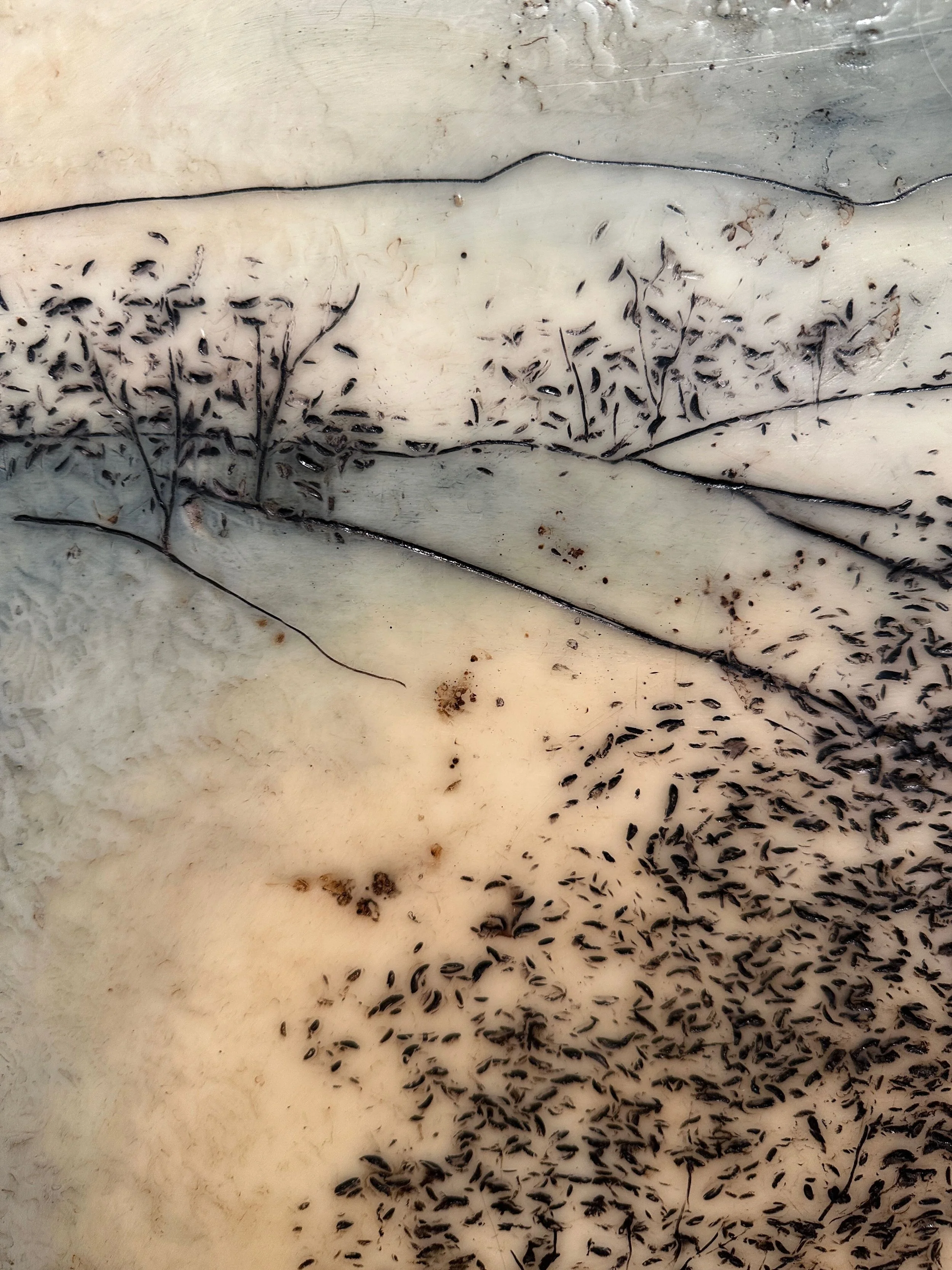 Her wax encaustic builds on her experience with both acrylic painting and print making, utilising as it does both modalities.