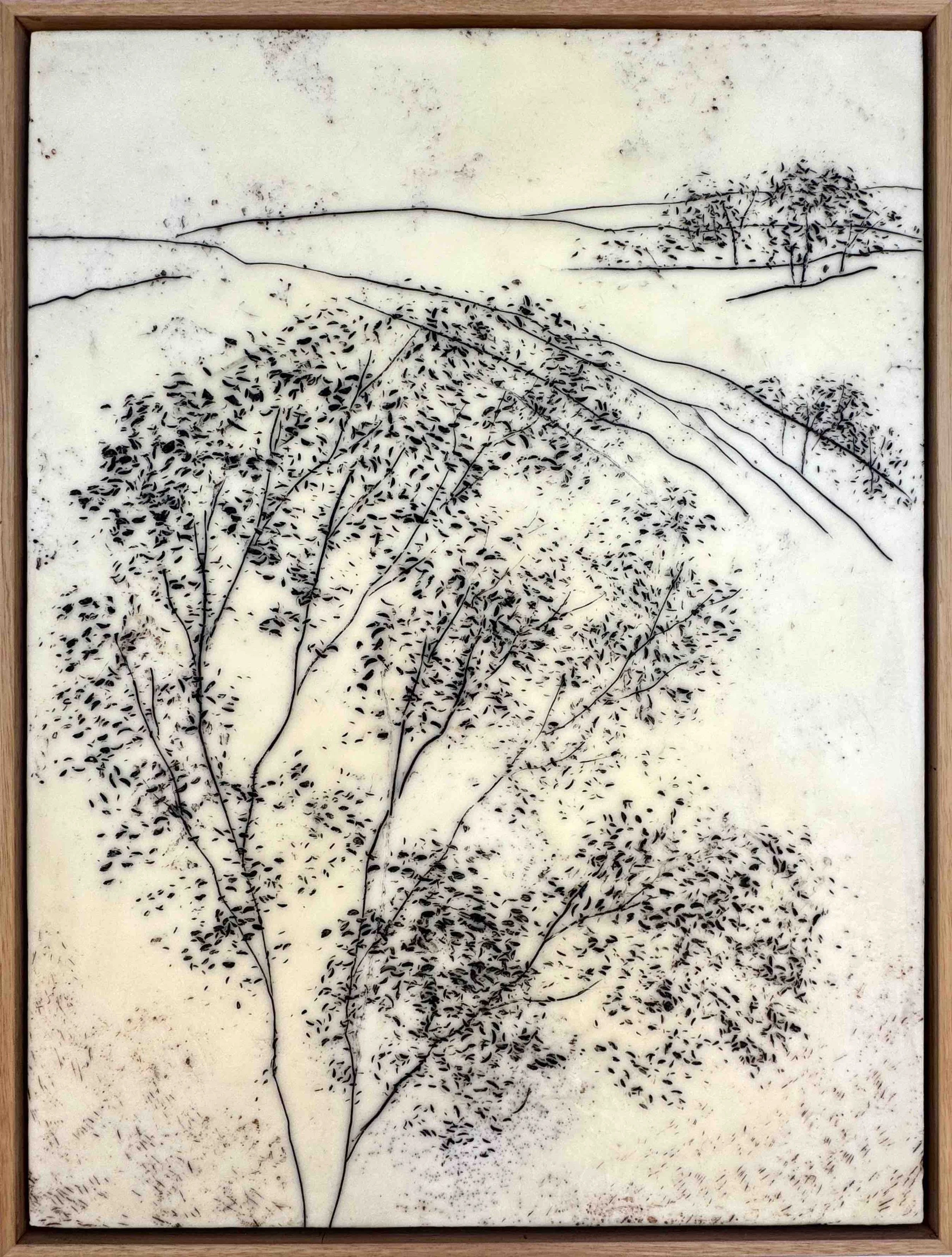 Her wax encaustic builds on her experience with both acrylic painting and print making, utilising as it does both modalities.