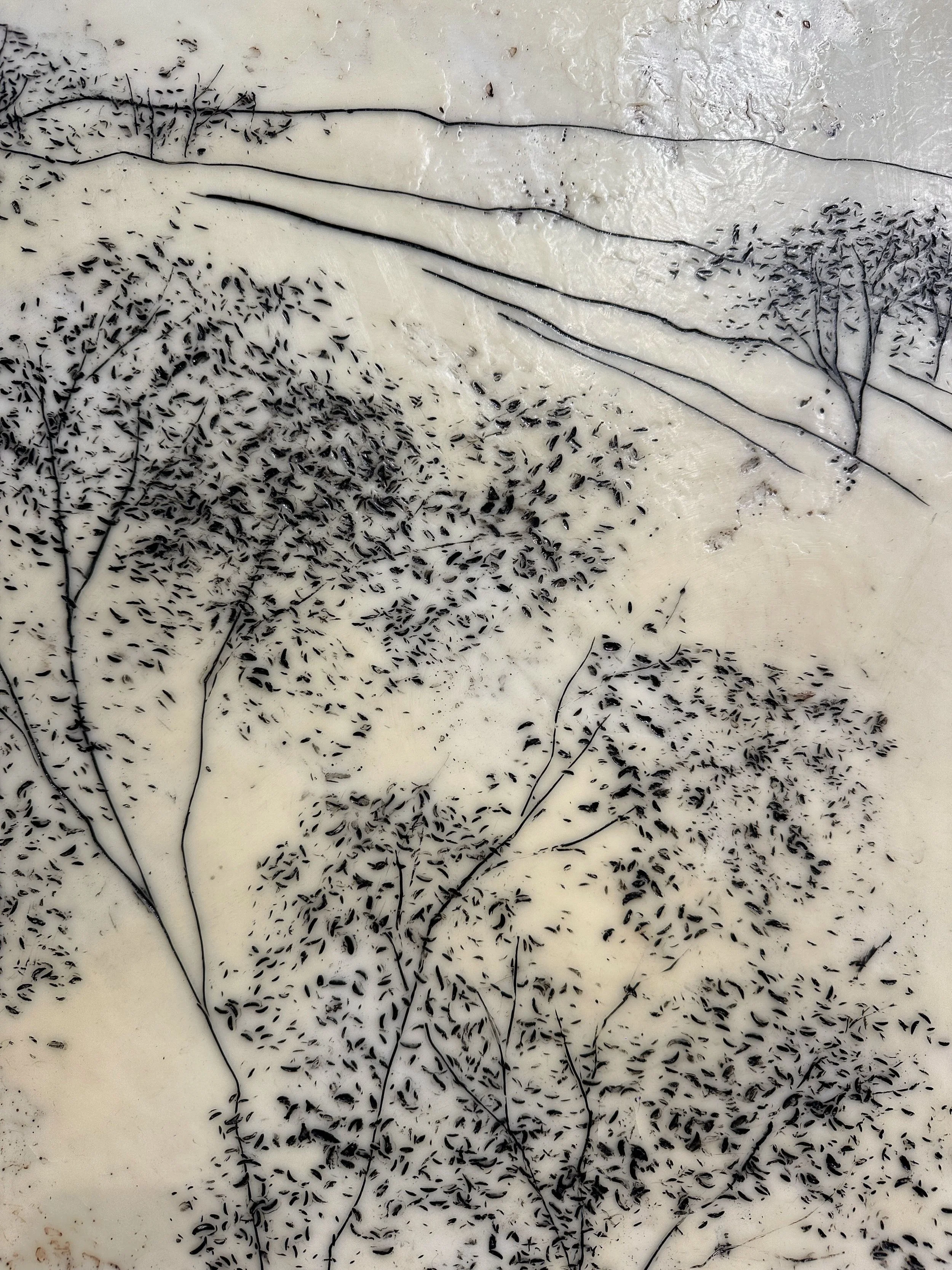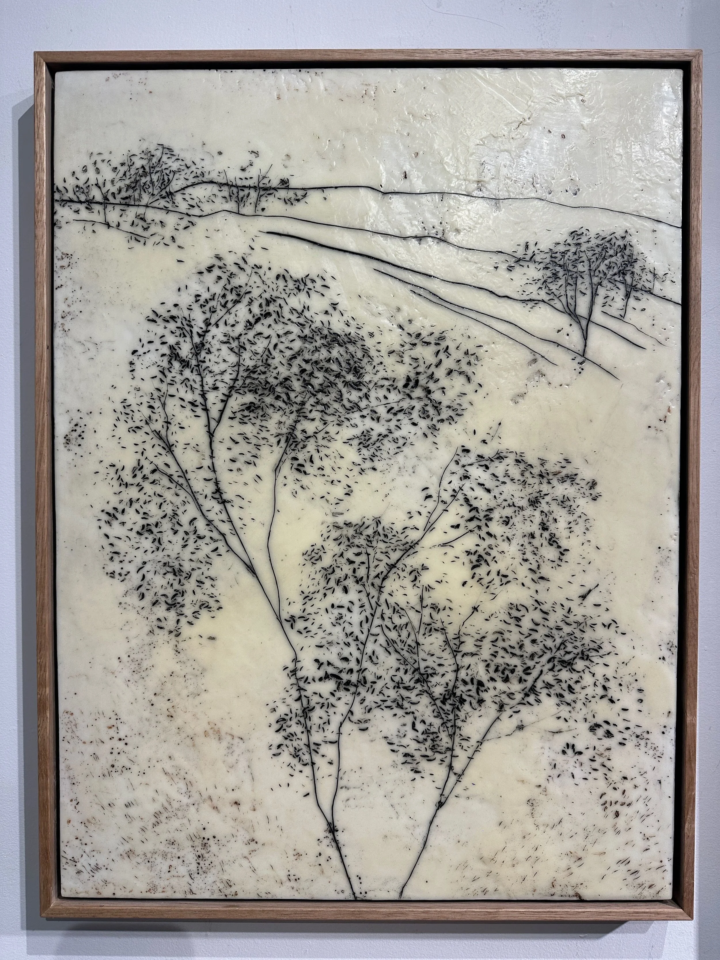 Her wax encaustic builds on her experience with both acrylic painting and print making, utilising as it does both modalities.