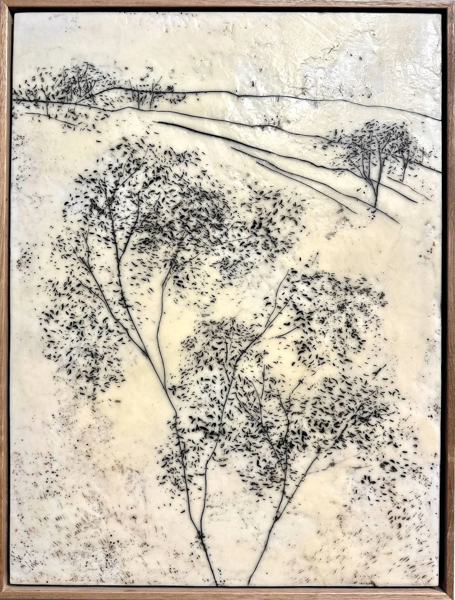 Kathryn works with wax encaustic, oil, acrylic, and mixed media to create these captivating textural landscapes.