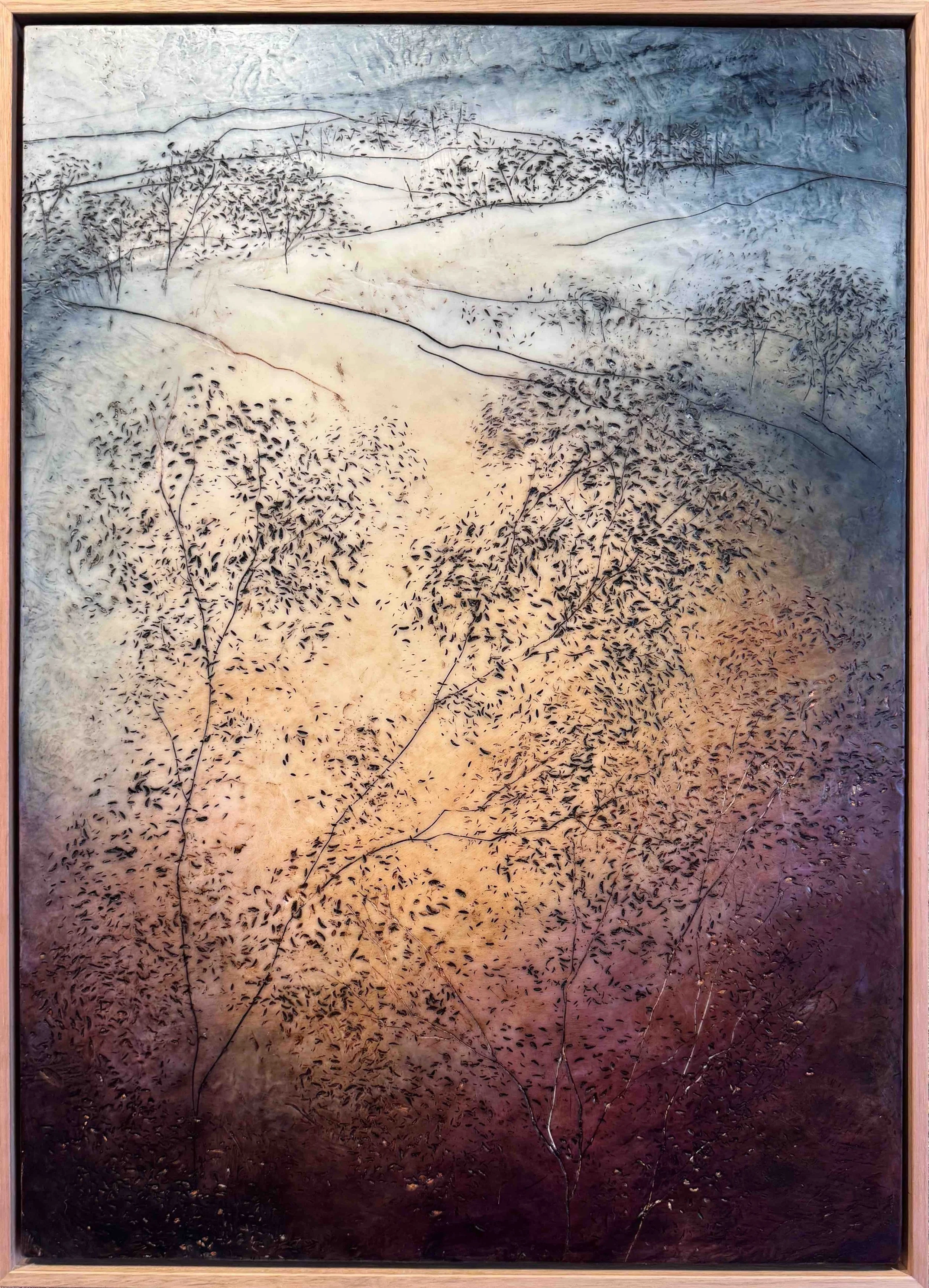 Her wax encaustic builds on her experience with both acrylic painting and print making, utilising as it does both modalities.