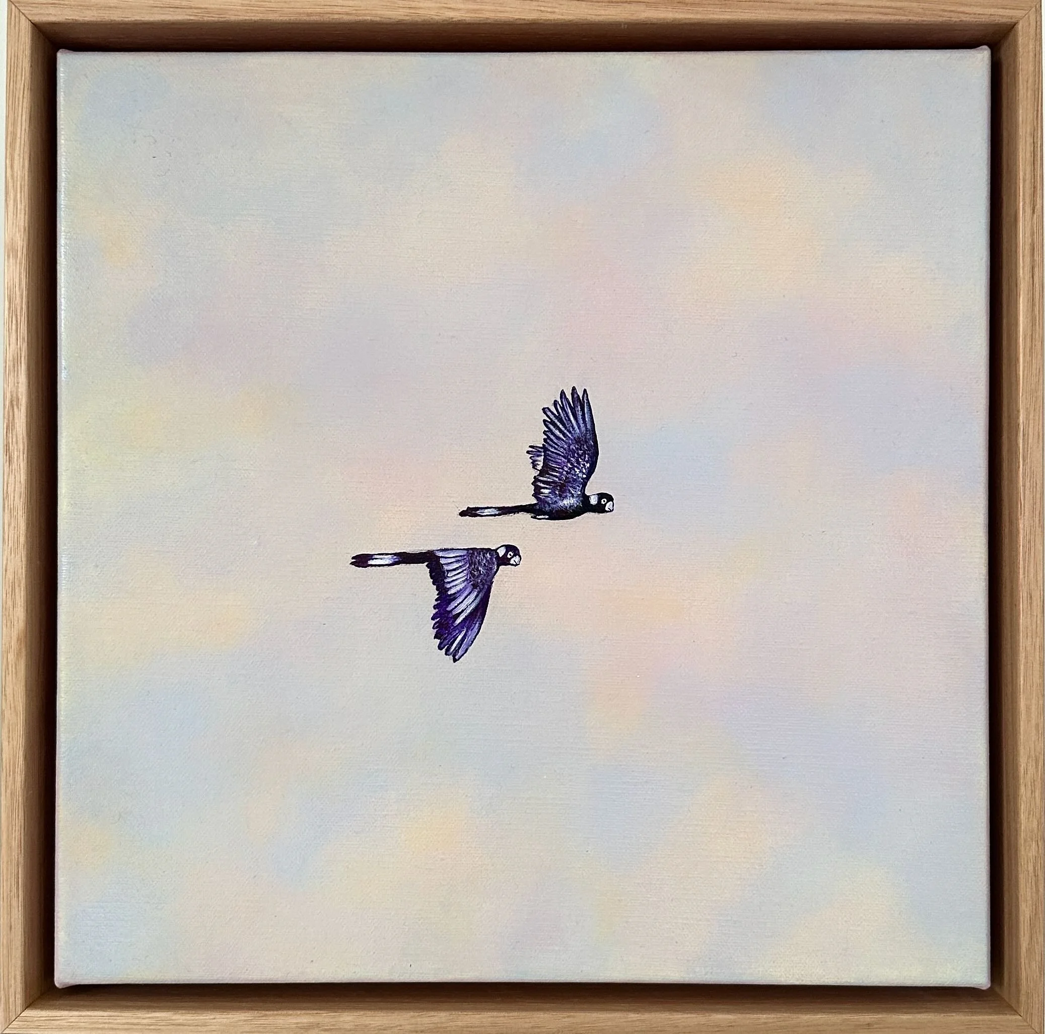 The oil painted birds are sharply focused, contrasting with the misty amorphous sky. I’ve chosen this contrast as a way of highlighting the birds. I’ve painted the black cockatoos in monochrome violet and white, and not their characteristic black and yellow, this is to draw attention to the detail in the feathers and the light reflecting off the feathers.