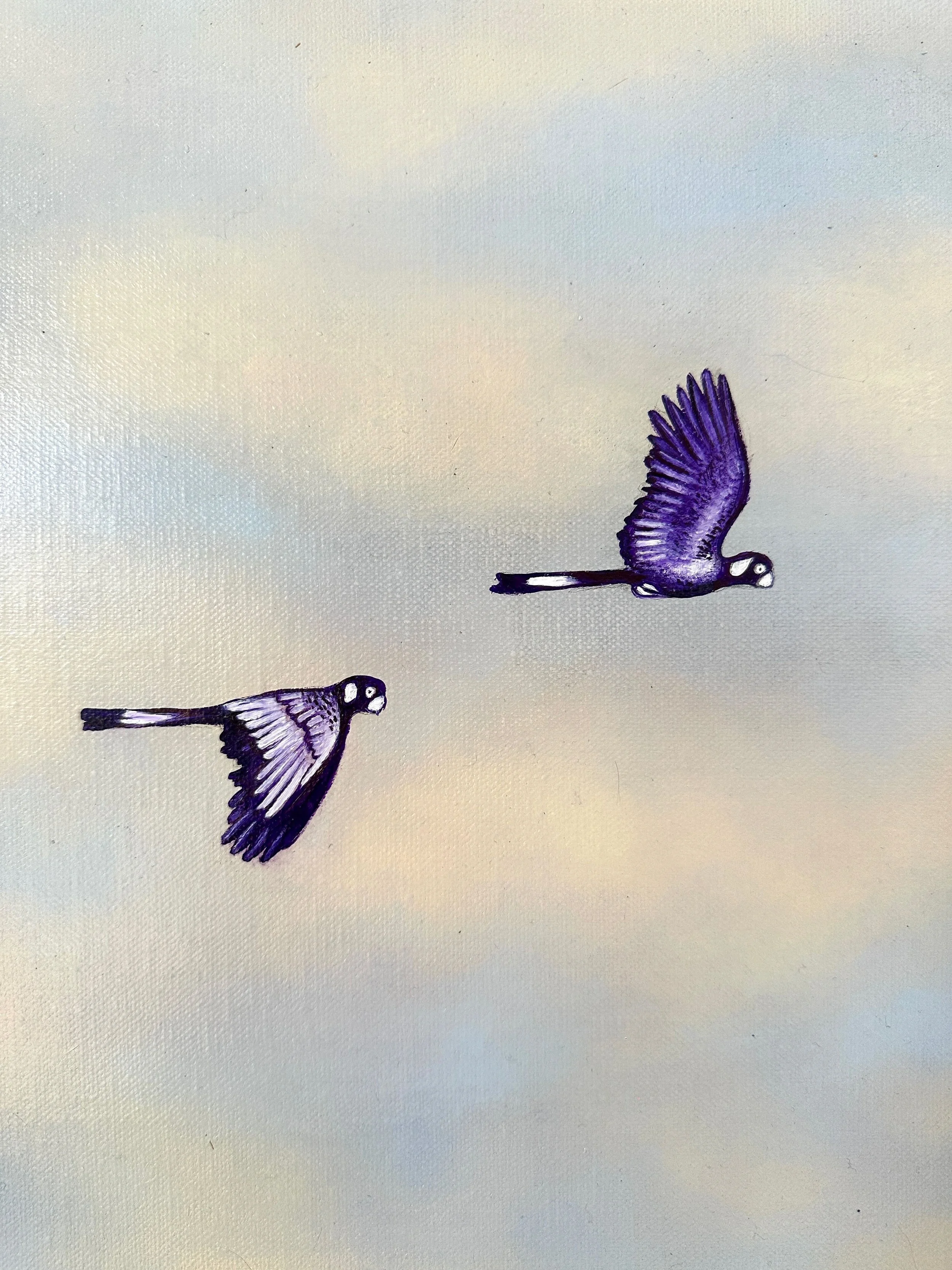 The oil painted birds are sharply focused, contrasting with the misty amorphous sky. I’ve chosen this contrast as a way of highlighting the birds. I’ve painted the black cockatoos in monochrome violet and white, and not their characteristic black and yellow, this is to draw attention to the detail in the feathers and the light reflecting off the feathers.