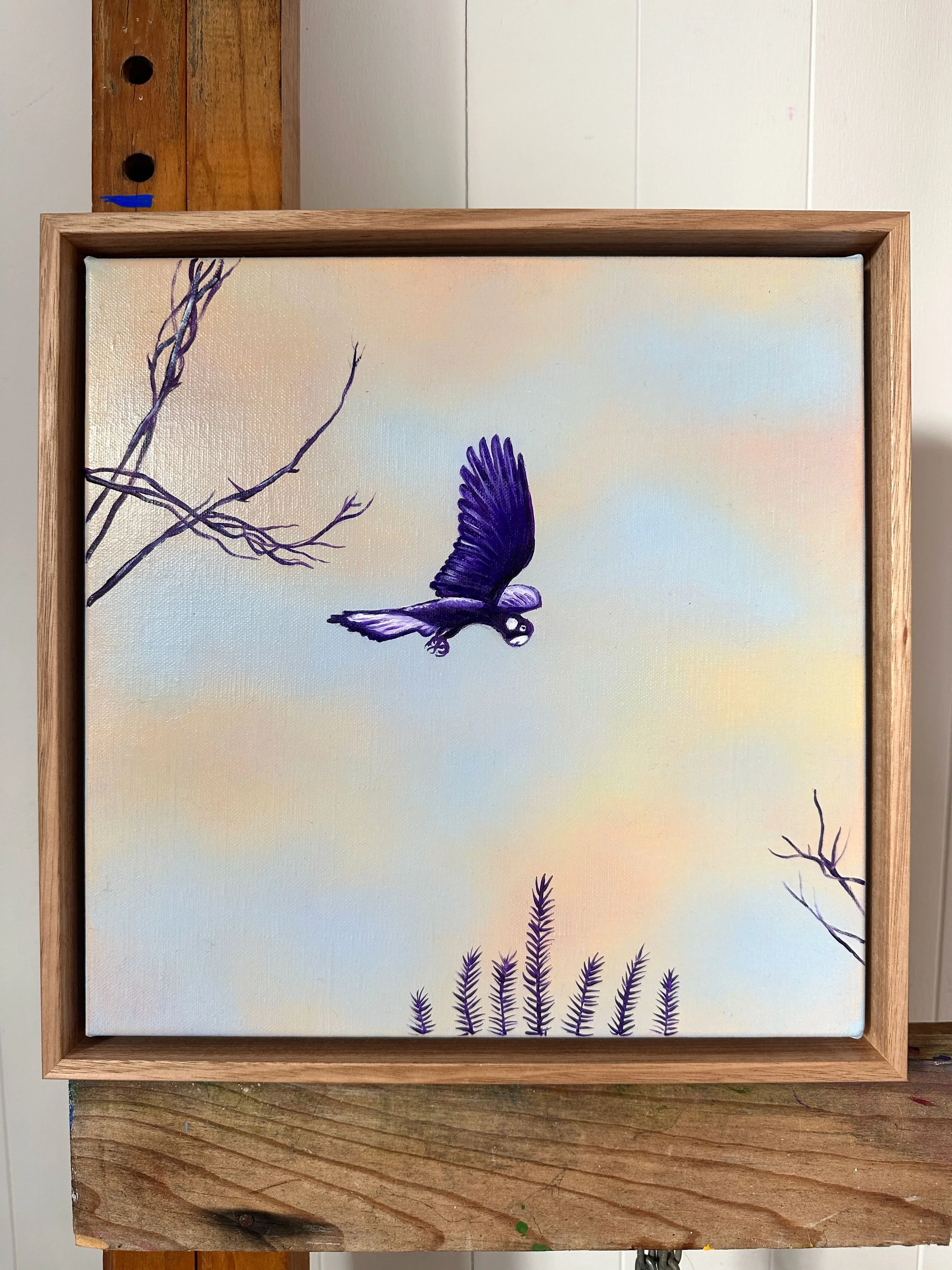 The oil painted birds are sharply focused, contrasting with the misty amorphous sky. I’ve chosen this contrast as a way of highlighting the birds. I’ve painted the black cockatoos in monochrome violet and white, and not their characteristic black and yellow, this is to draw attention to the detail in the feathers and the light reflecting off the feathers.