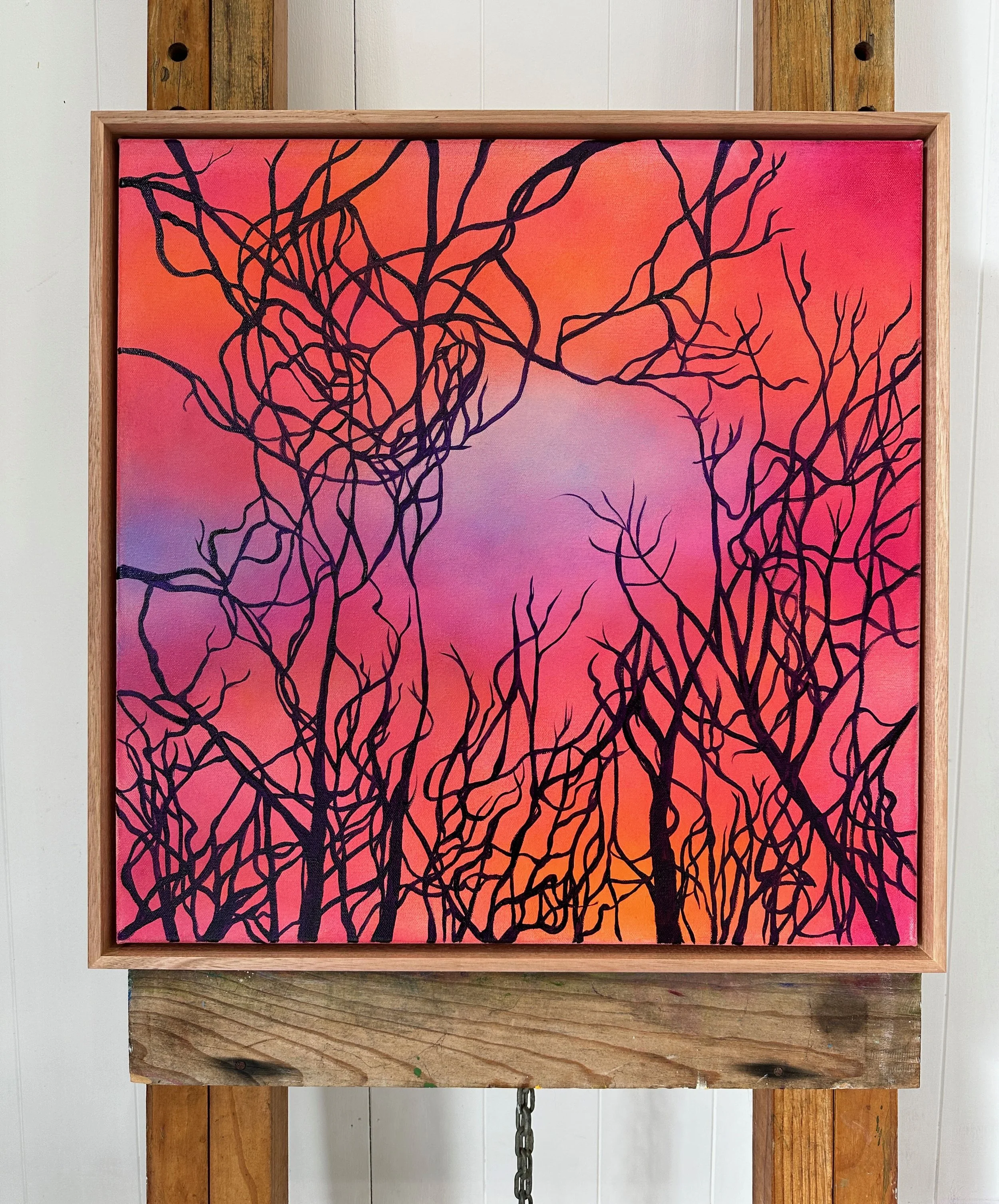 With a background in electronic and temporal art (BVA, Sydney College Of The Arts 1997 - 1999), Katoomba based artist Olivia Shimeld has found a way to give her paintings a uniquely digital aesthetic. Her ethereal abstract landscapes, vast sunsets with birds, night skies and floral assemblages flash with vibrant neon colours layered atop one another, creating a depth of space reminiscent of a digital screen. Olivia uses high quality acrylic, oil and aerosol paints which she intuitively allows to drip and splatter onto her canvas. At once meditative and energetic, Olivia’s work asks for contemplation as it blurs material boundaries.