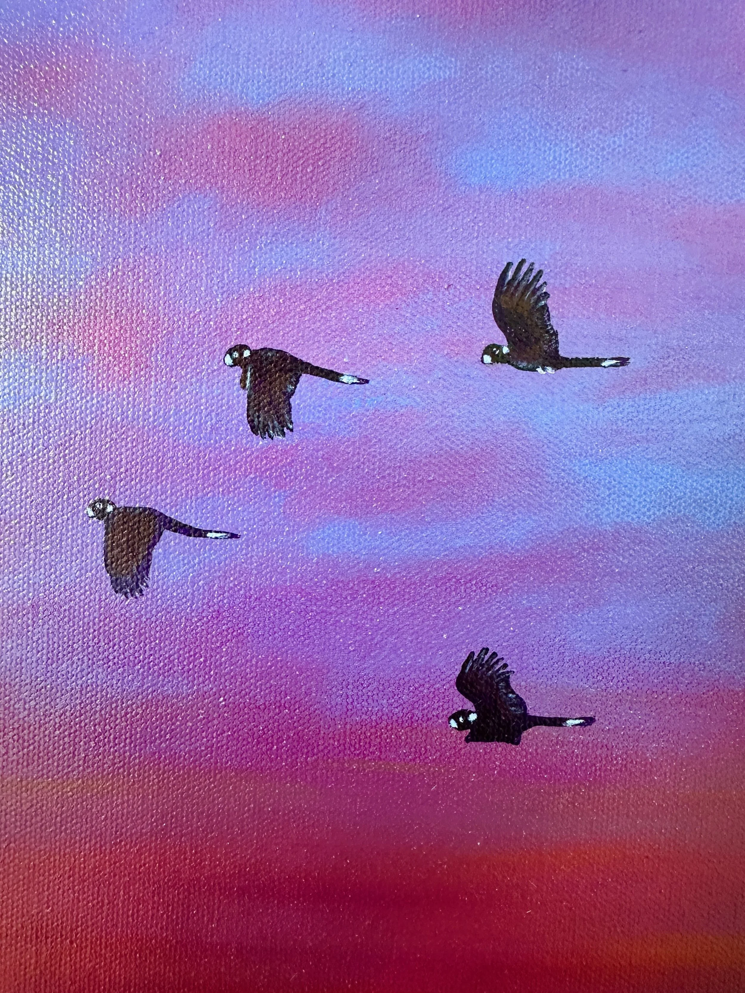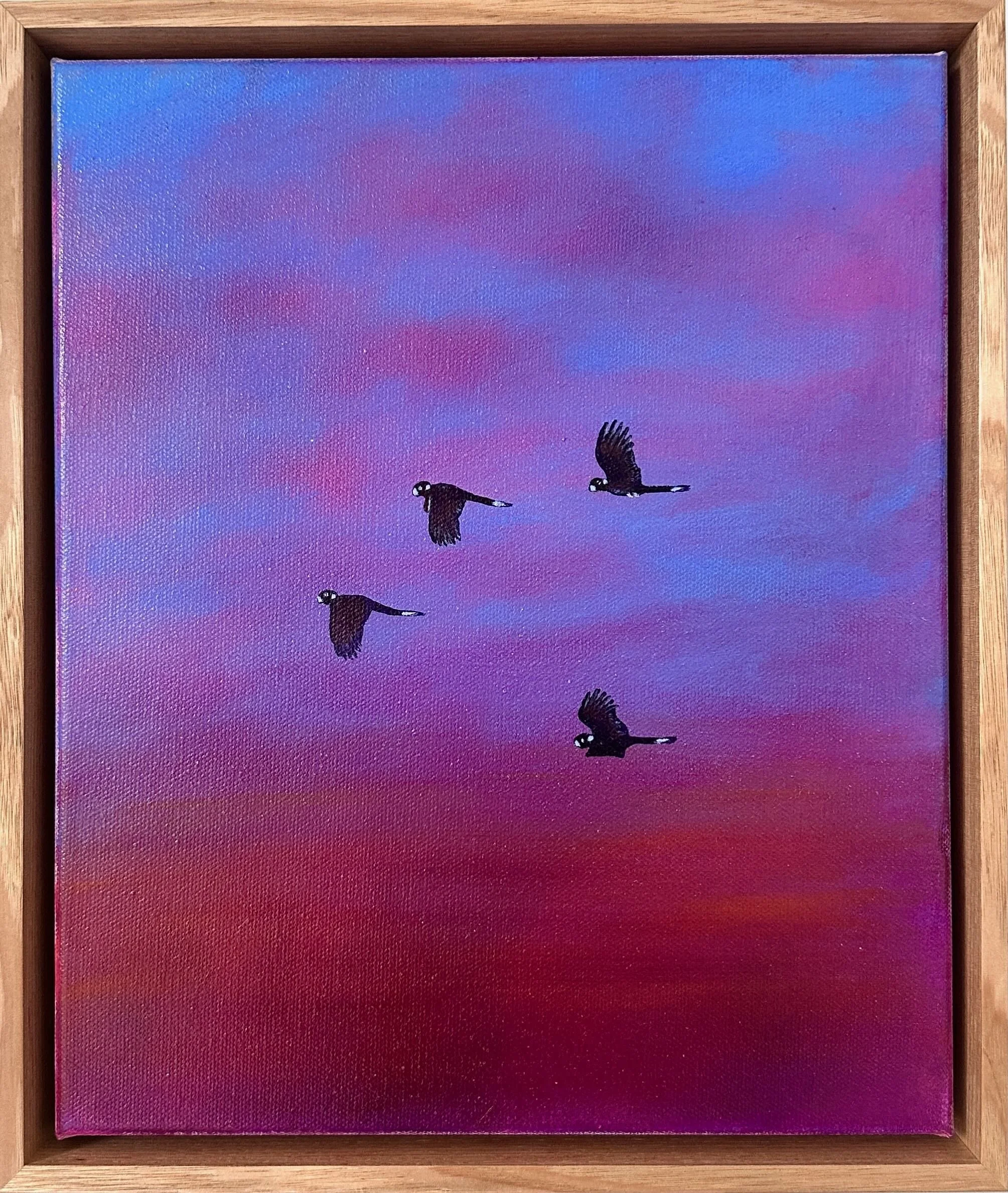 The oil painted birds are sharply focused, contrasting with the misty amorphous sky. I’ve chosen this contrast as a way of highlighting the birds. I’ve painted the black cockatoos in monochrome violet and white, and not their characteristic black and yellow, this is to draw attention to the detail in the feathers and the light reflecting off the feathers.