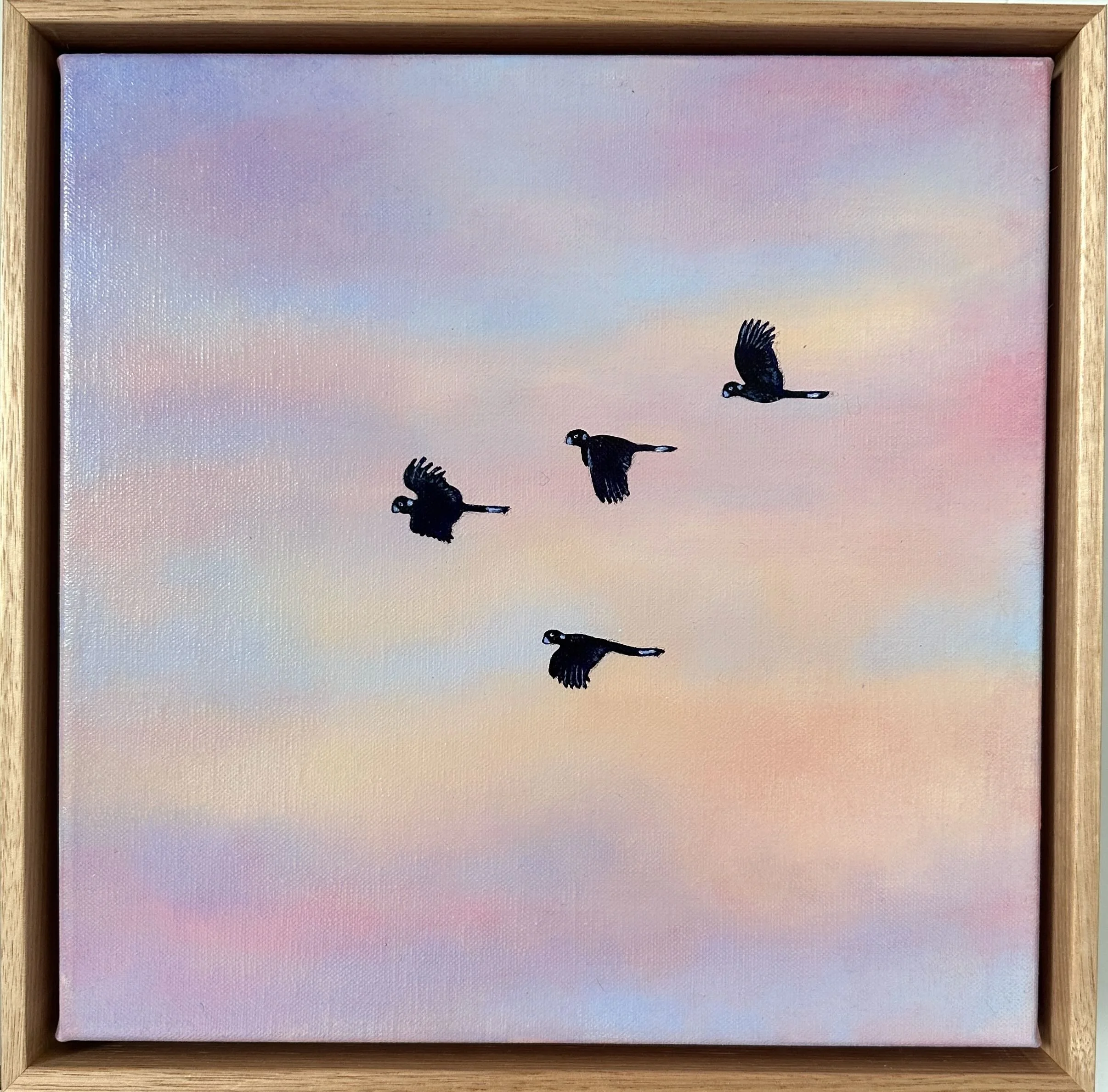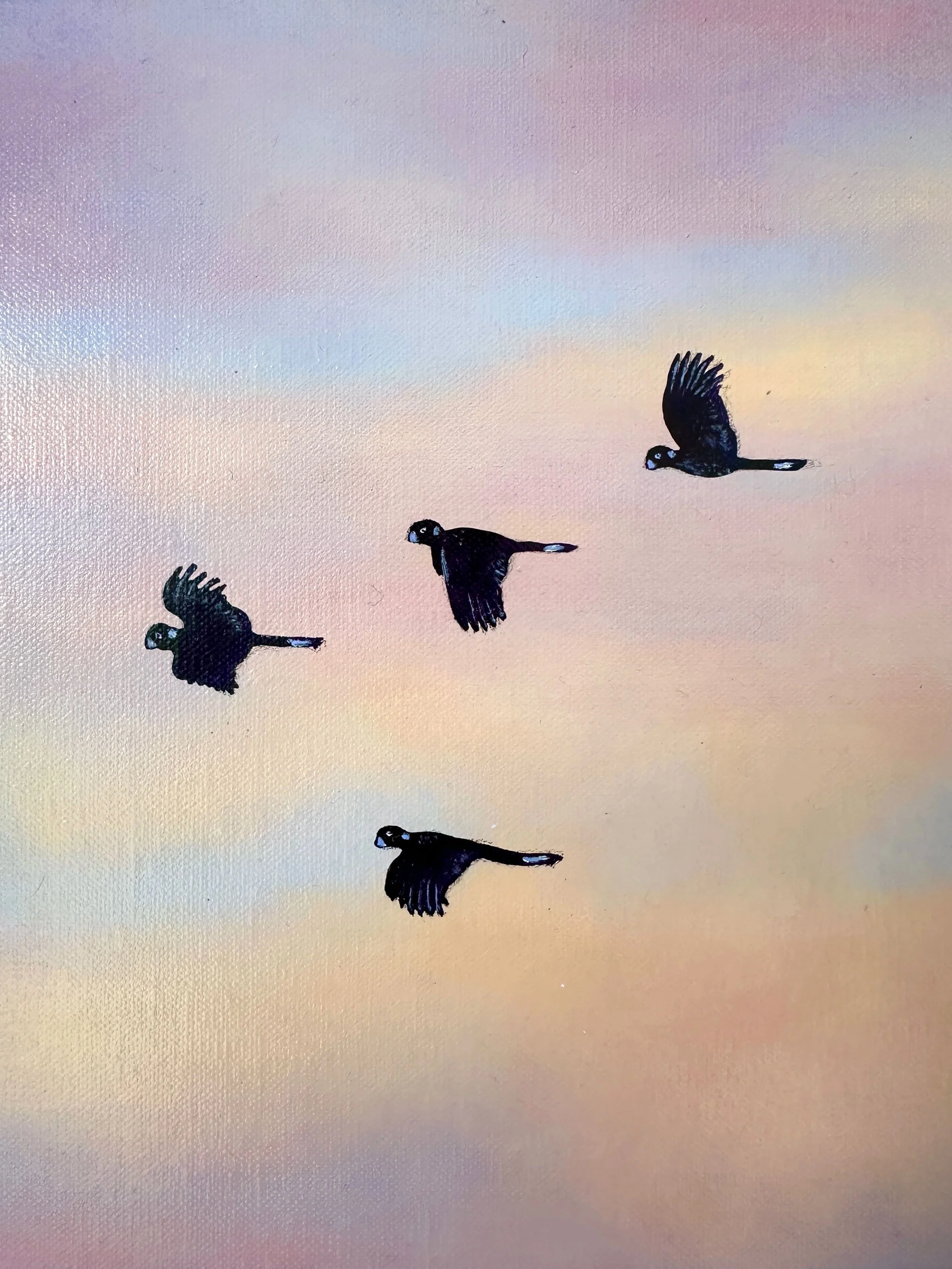 My Cloud Sky With Black Cockatoo series grew from earlier Cloud Sky With Birds paintings - In this series of works I focus closely on the majestic yellow-tailed black cockatoo. Against softly blurred, cloud-filled skies—hand-painted in acrylic gesso, then glazed in oil paint—the birds emerge in sharp detail. This contrast draws the eye to their form and presence.