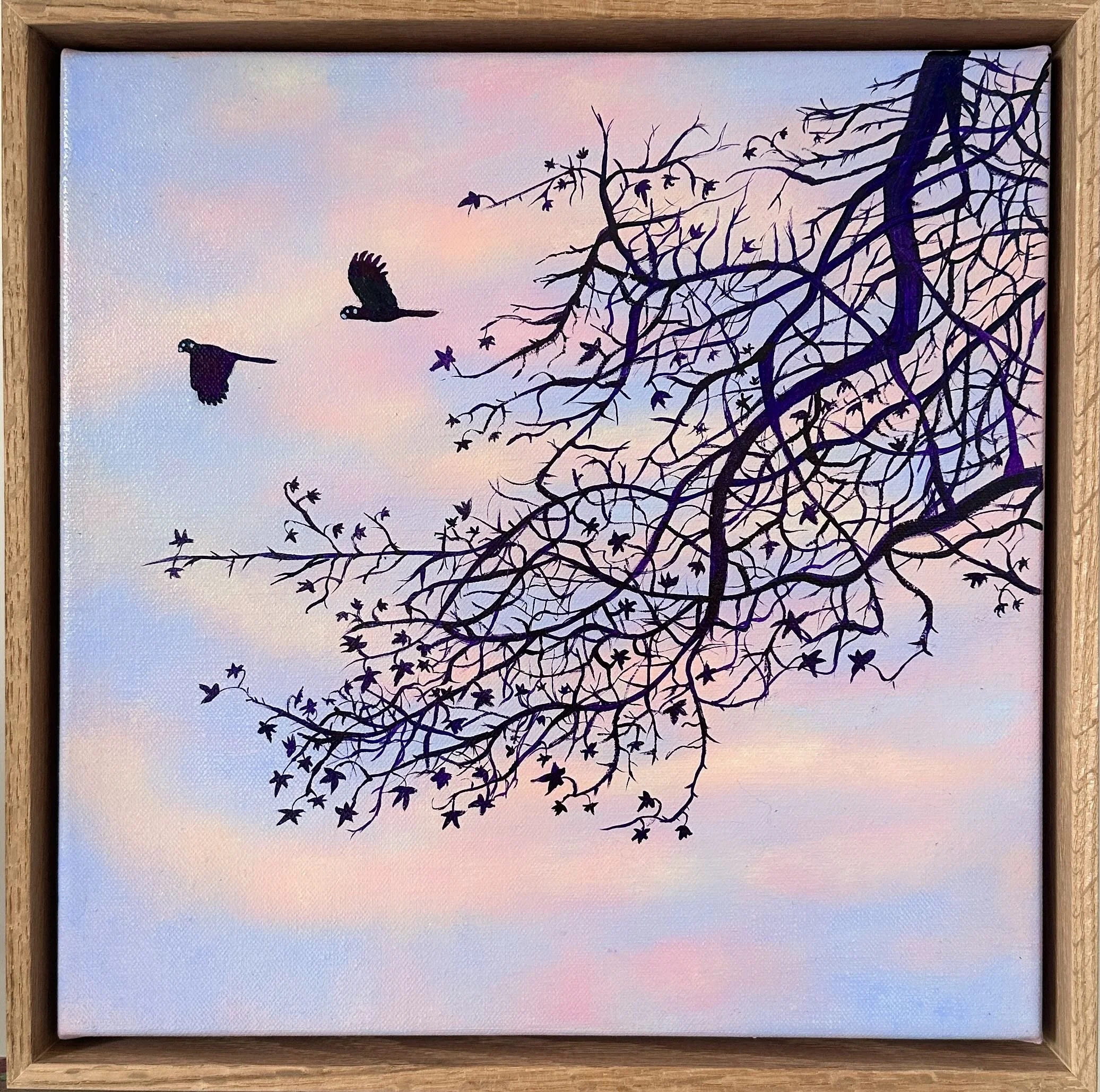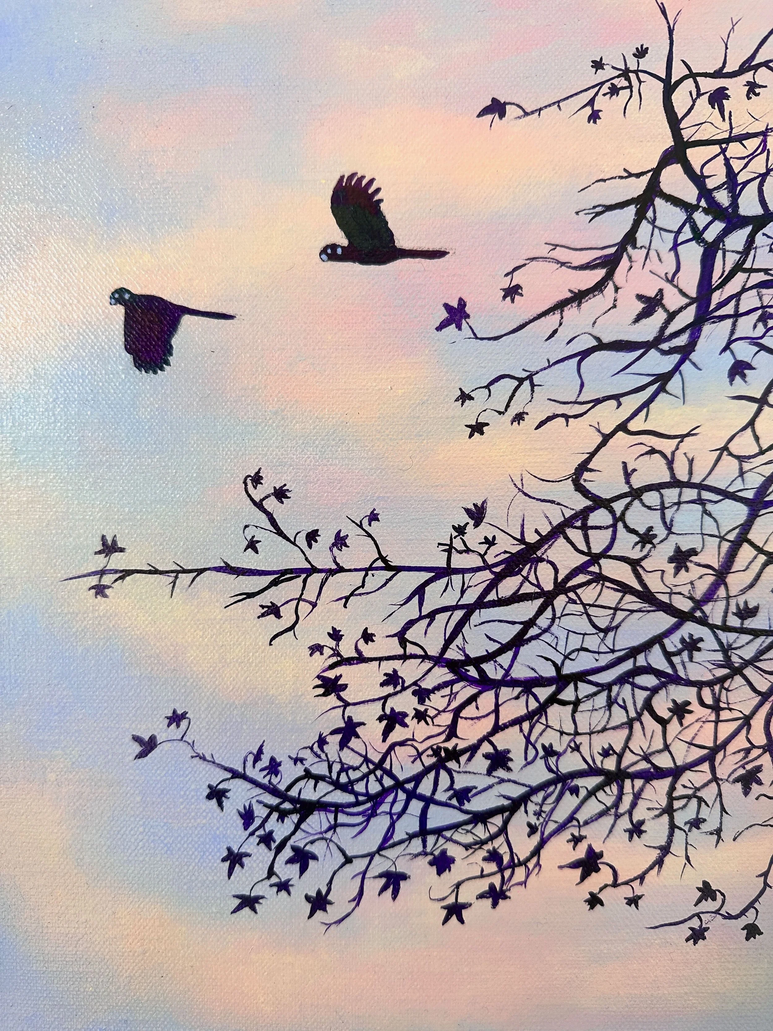 The oil painted birds are sharply focused, contrasting with the misty amorphous sky. I’ve chosen this contrast as a way of highlighting the birds. I’ve painted the black cockatoos in monochrome violet and white, and not their characteristic black and yellow, this is to draw attention to the detail in the feathers and the light reflecting off the feathers.