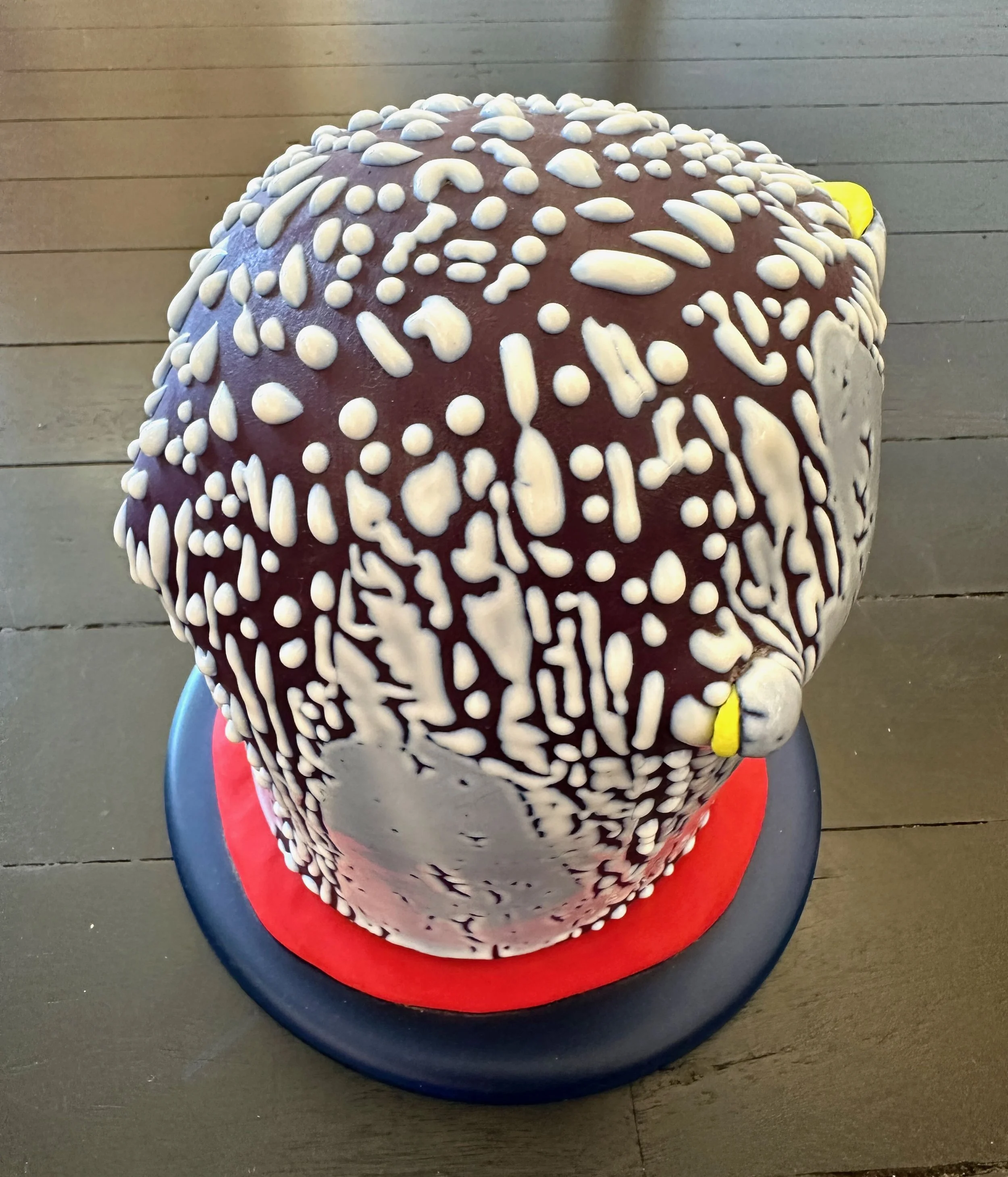 porcelain, underglaze, polymer clay, epoxy resin, glaze, gold and platinum lustre, and fluorescent acrylic